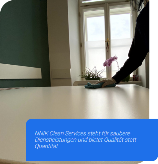 NNIK ist ein moderner Reinigungsdienst mit klaren Werten: Zuverlässigkeit, Sorgfalt und Kundenorientierung. Wir wissen, dass Reinigung Vertrauenssache ist – und genau deshalb setzen wir auf konsequente Leistung. Unsere MitarbeiterInnen sind nicht nur bestens geschult, sondern auch engagiert, freundlich und diskret. Ob regelmäßige Unterhaltsreinigung, gründliche Stiegenhausreinigung oder Sonderreinigungen – wir erstellen individuelle Lösungen für jeden Bedarf. Denn für uns zählt nicht nur, dass es sauber ist – sondern dass Sie sich gut aufgehoben fühlen.